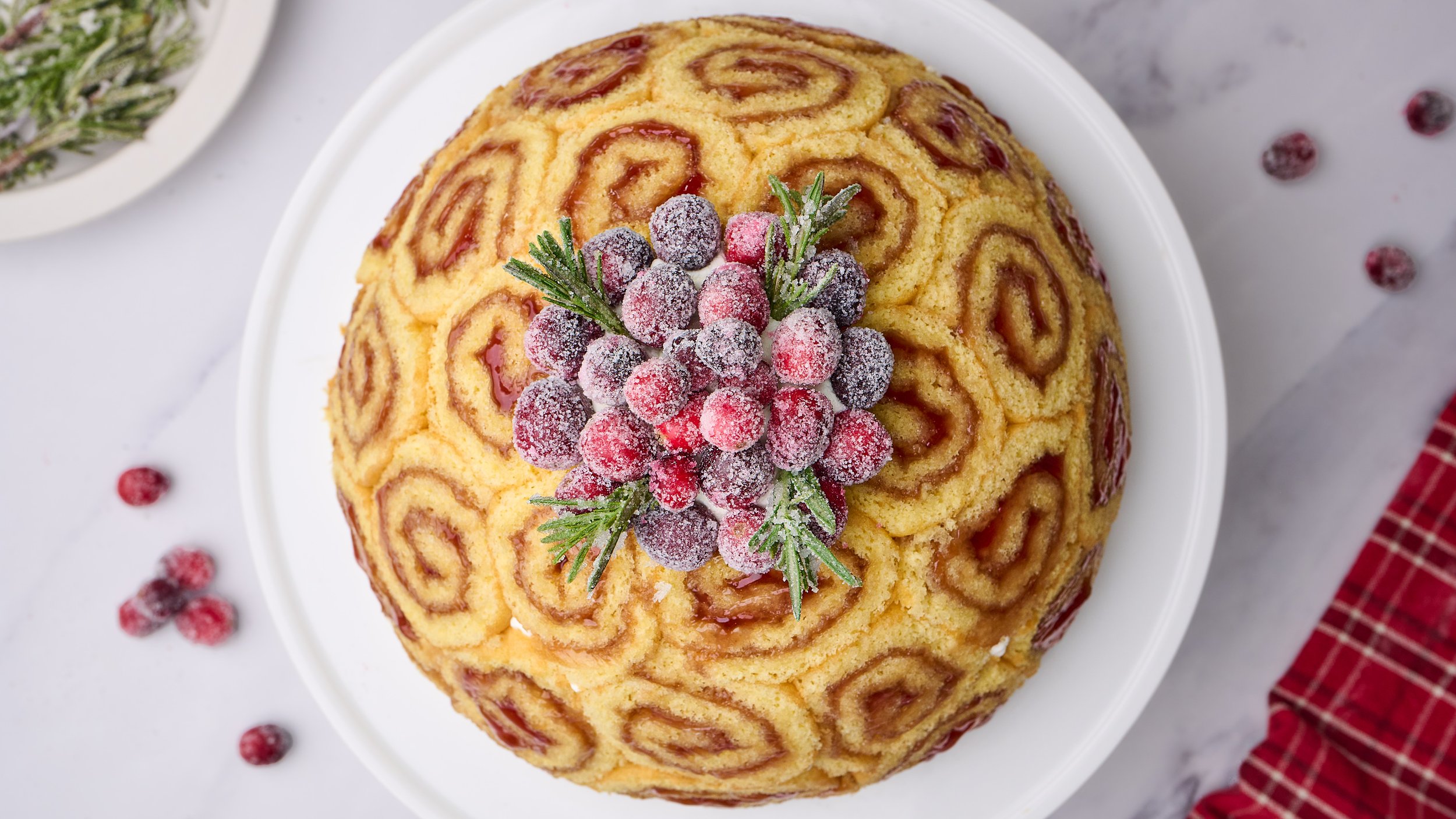 Everything is built in a bowl. You start by making a raspberry-jam-filled Swiss roll, slice it into thin spirals, and line your bowl to create that decorative swirled shell. Inside, I layer chocolate and vanilla diplomat cream (pastry cream folded with whipped cream) for a striped interior that looks just as dramatic as the outside.