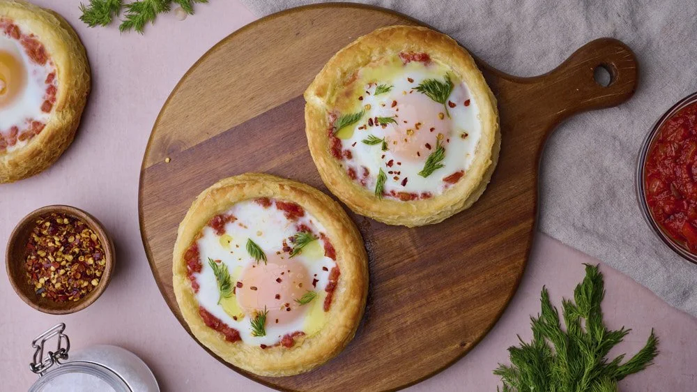 Flaky breakfast pastry with spiced tomato sauce & a soft egg