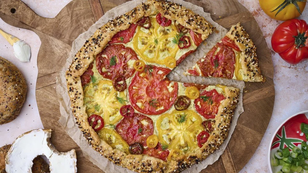 All-Purpose Flour, Kosher Salt, Black Pepper, Sugar, Unsalted Butter, Apple Cider Vinegar, Everything Bagel Seasoning, Eggs, Cream Cheese, Sour Cream, Lemon, Garlic, Scallions, Dill, Heirloom Tomatoes, Cherry or Grape Tomatoes