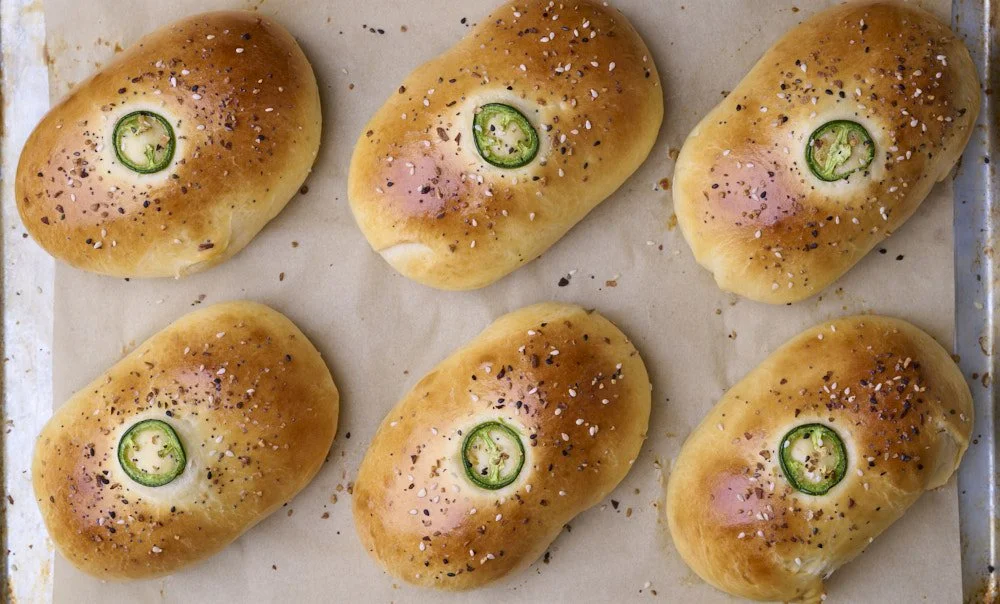 All-Purpose Flour, Nonfat Dry Milk Powder, Kosher Salt, Instant Yeast, Granulated Sugar, Honey, Whole Milk, Eggs, Unsalted Butter, Jalapeño Cheese Sausage Links, Sharp Cheddar Cheese, Fresh Jalapeño (optional), Everything Bagel Seasoning or Poppy Seeds (optional)