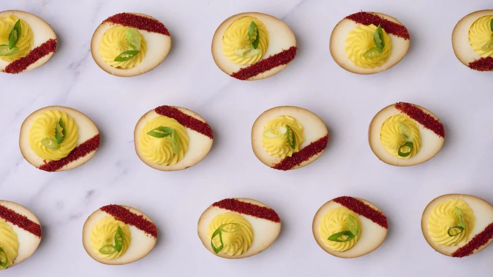 Umami-rich deviled eggs with scallions and Korean chile flakes