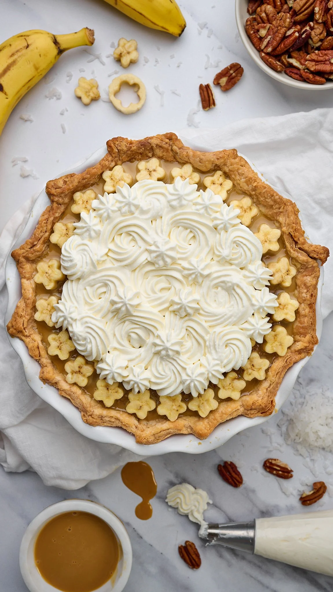 Sounds like a strange combo, but it bakes into a rich, gooey filling that tastes like a cross between pecan pie and a coconut macaroon. The fresh banana and whipped cream topping are non-negotiable. Dulce de leche is optional—but my mom sometimes added it, and it pairs beautifully with the other flavors.