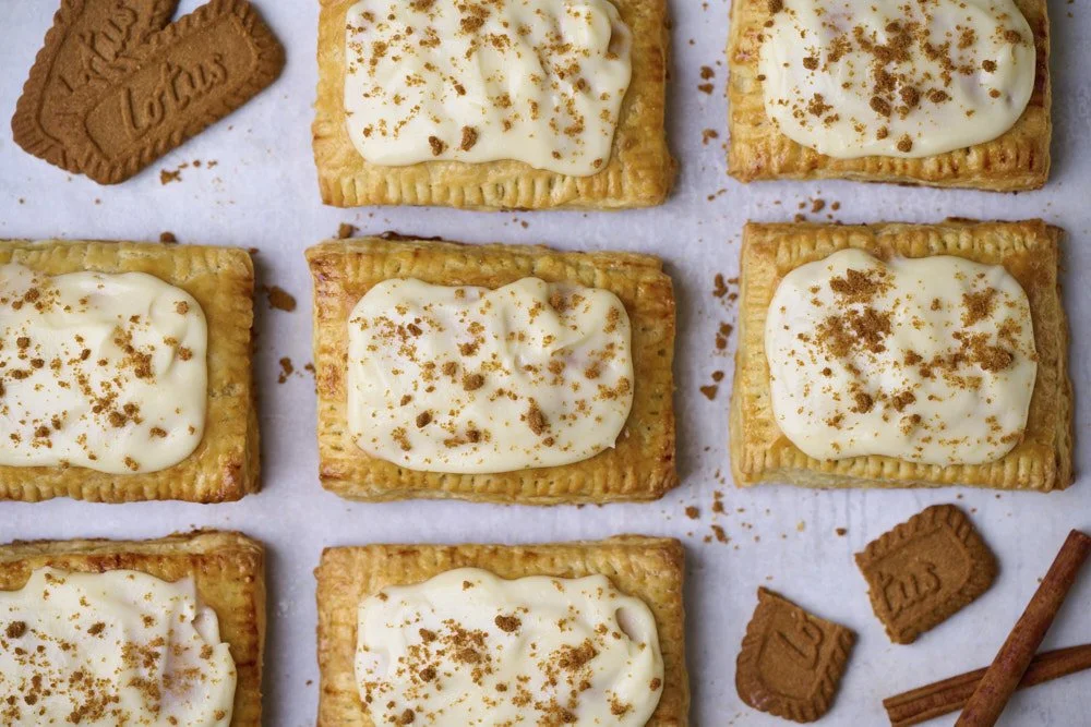 All-Purpose Flour, Sugar, Salt, Unsalted Butter, Sour Cream, Egg, Lotus Biscoff Cookies, Light Brown Sugar, Cinnamon, Vanilla Extract, Heavy Cream, Cream Cheese, Powdered Sugar