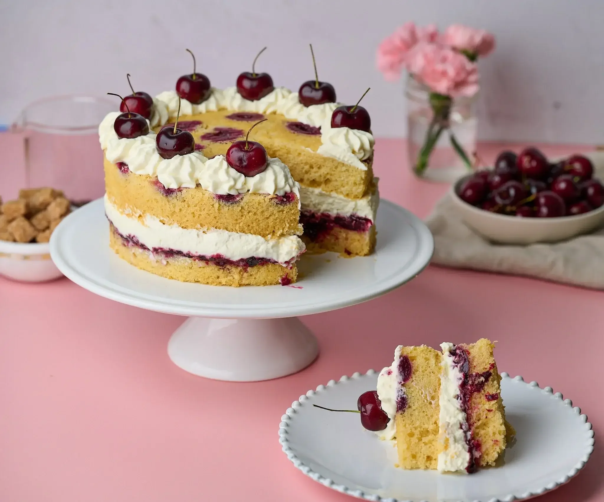 Sweet Red Cherries, Lemon, Granulated Sugar, Superfine Sugar, Self-Rising Flour, Eggs, Unsalted Butter, Crème Fraîche, Heavy Cream, Vanilla Extract, Salt