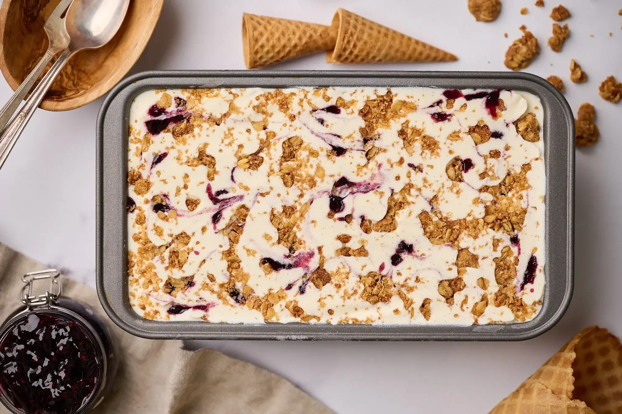 Creamy ice cream with a buttery oat streusel & swirls of berry jam