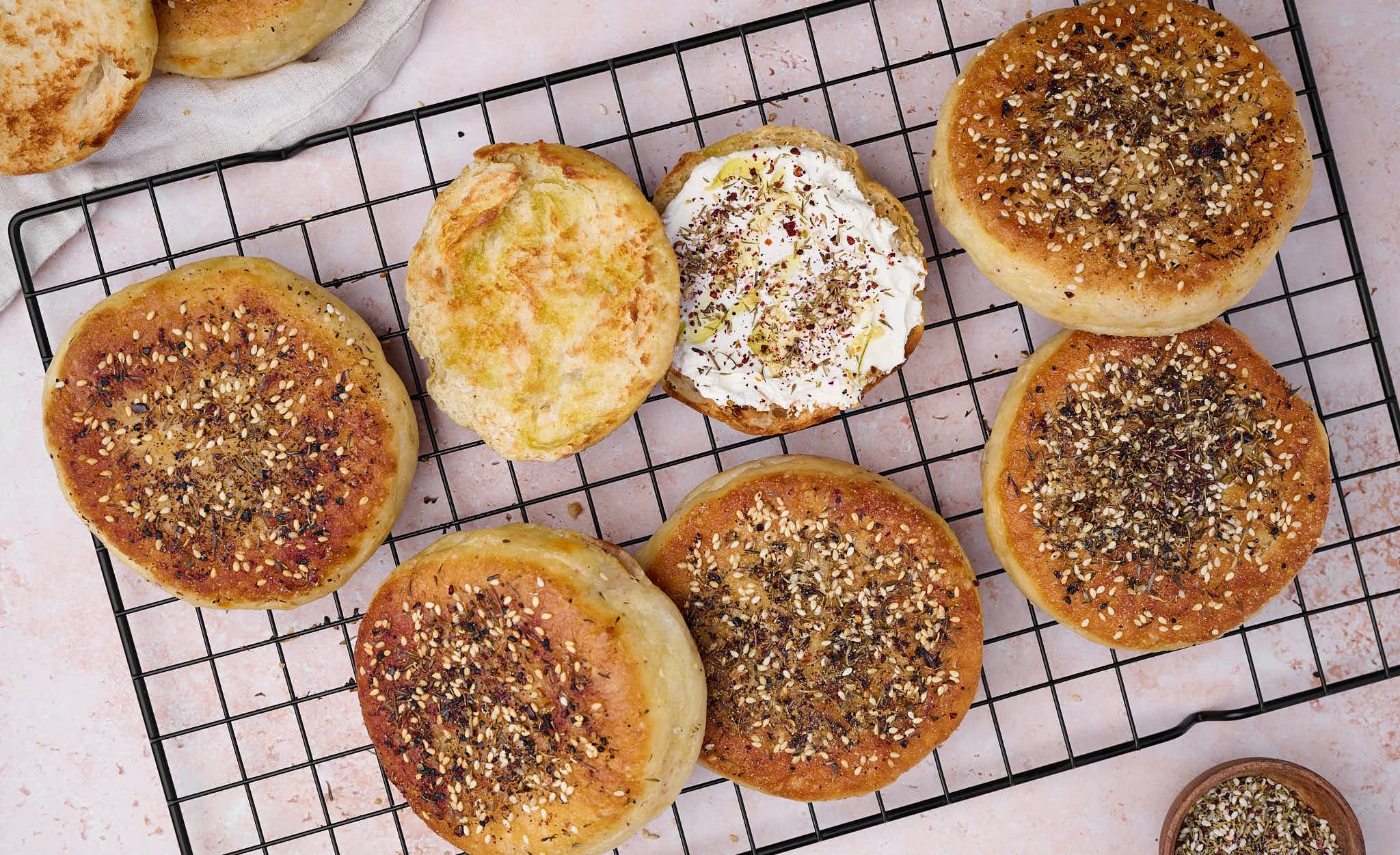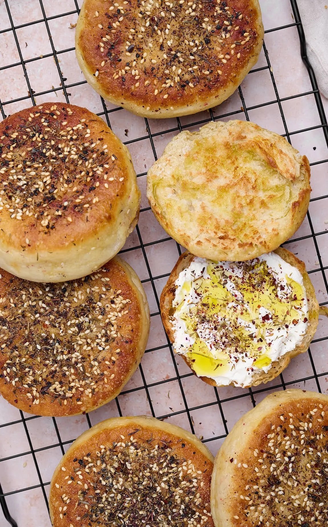 Unlike traditional English muffins cooked in a dry pan, these are pan-fried in olive oil and coated in za’atar, a Levantine spice blend of sesame, sumac, and herbs. The result is a savory, salty English muffin that’s great on its own or topped with labneh, eggs, tomatoes, or avocado.